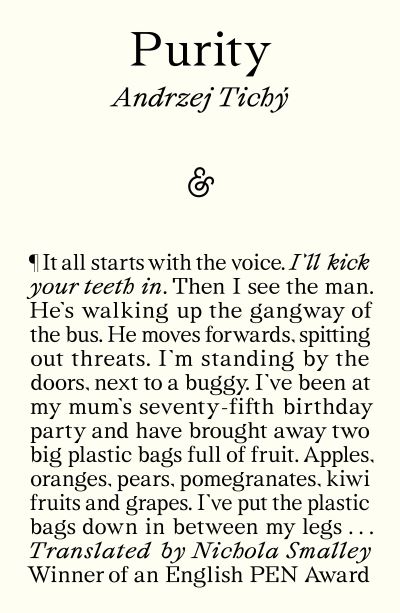 The stories in Purity take the reader through cities and suburbs, apartments and streets, to find characters struggling to survive in modern society: a man has an outburst on a bus; a fugitive finds insight in a colour wheel; a social realist kills his friend with a hammer; a thief finds himself in books. And cleaners reluctantly go on cleaning. With gravity and humour, against the backdrop of a violent civilization, people are depicted as fallen, or waiting to fall, rendered by Tichý with the fury, compassion and emotional complexity of Kendrick Lamar.